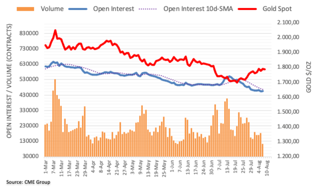 根据芝加哥商品交易所集团(CGrou)的黄金期货初步数据显示,周四未平仓合约逆转连续四个交易日的跌势,当日增加约2500份合约。另一方面,成交量连续第二个交易日萎缩,当日减少了870份合约。 金价目前的目标是1800美元 周四,黄金价格延续了最近的复苏势头,未平仓头寸不断增加。在此背景下,金价仍有望重返1800美元