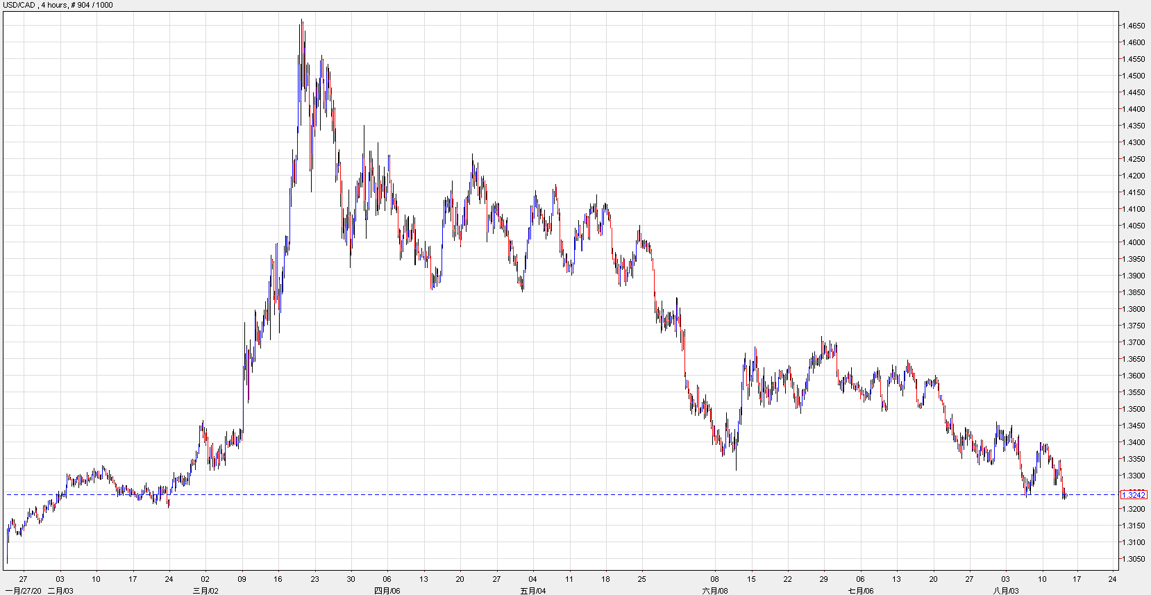 4.美元兑加元走势4小时图,短线处于一浪低于一浪的下降趋势,建议短线投资者于1.3260沽出美元,买入加元,目标1.3150,以1.33为止损。