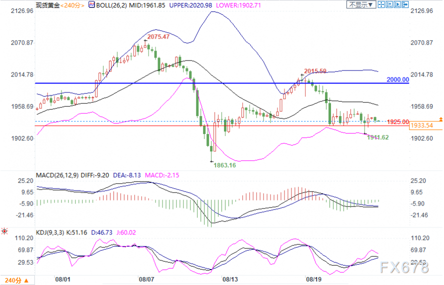 下方初步支撑先留意1925.00附近,这先后在上周三、周四被测试;强支撑重点留意1900关口。若跌破将提振市场看空情绪,金价可能回踩8月12日低点1863.16,这同时受50日均线支撑。此外,上周五低点1911.62也可简单留意。