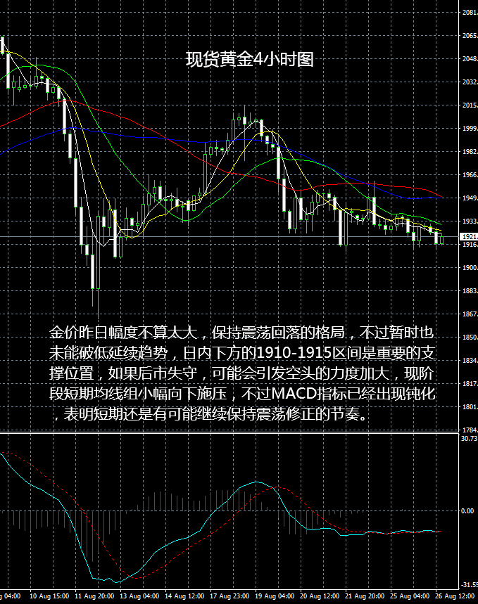从现货黄金4小时图看,金价昨日幅度不算太大,保持震荡回落的格局,不过暂时也未能破低延续趋势,日内下方的1910-1915区间是重要的支撑位置,如果后市失守,可能会引发空头的力度加大,现阶段短期均线组小幅向下施压,不过MACD指标已经出现钝化,表明短期还是有可能继续保持震荡修正的节奏。