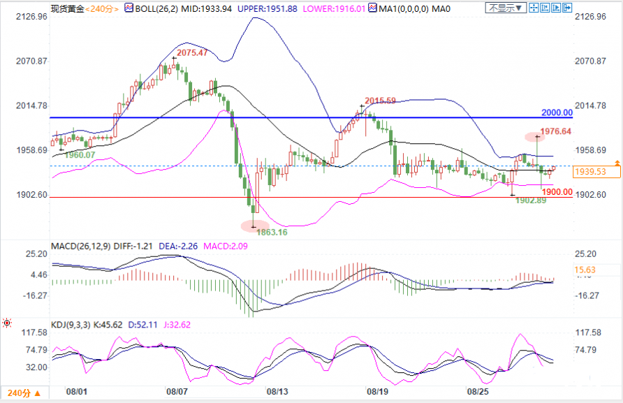 下方初步支撑先留意1900关口,这是重要心理关口,也与本周触及的低点相近。若跌破将提振市场看空情绪,金价可能回踩8月12日低点1863.16。此外,布林带下轨1878.35也需要留意。