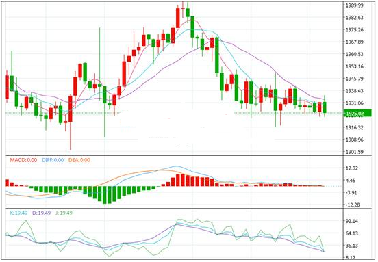 从日线图上看,布林带有拐头向下迹象,金价徘徊中轨与下轨之间。MACD死叉、指数低于10,KDJ死叉、指数位于40下方。从技术面看,黄金偏震荡走低,但预计短线不会跌破1900关口。