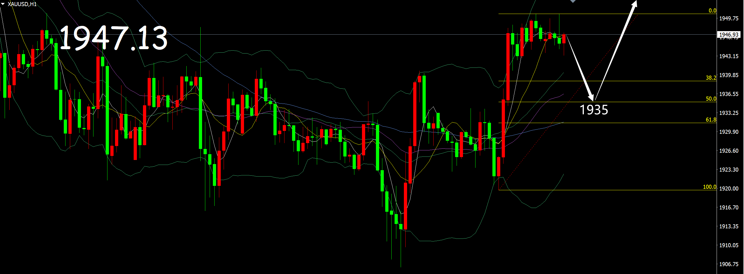 短线方面暂时看不了那么远,专注于日内的波动来交易即可,昨天回踩0.618支撑二次发力,向上破位了欧盘的高点以及周二高点1940之后最高触及1950附近,小时线方面肯定是偏多形态,也还有向上延续的空间,问题就在于现在并不是强势趋势,做多位置如果太高就会出现止损,另外昨天是日内向下回撤美盘发力而上升,今天也可能如此。
