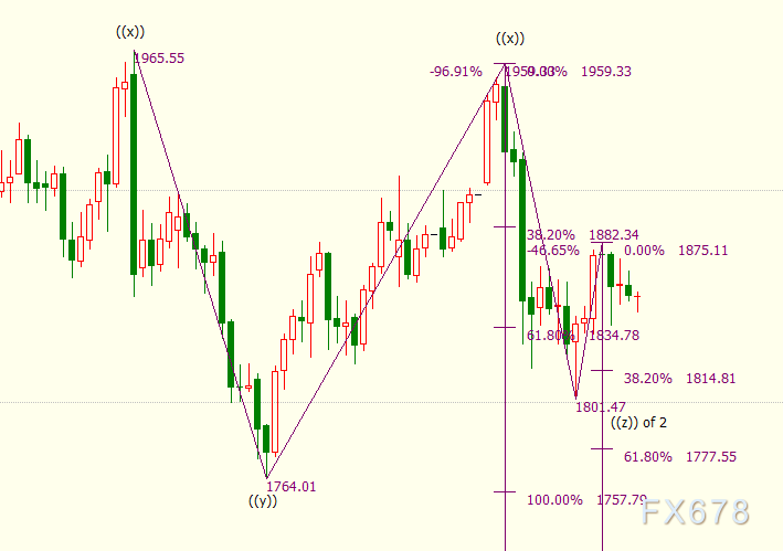 日线图上看,(c)浪是自1959美元开启的下行((z))浪的子浪,(c)浪的61.8%目标位在1778美元。((z))浪则隶属于自2075美元开启的调整2浪。2浪呈现三重三锯齿形结构,可细分为((w))((x))((y))((x))((z))五子浪。