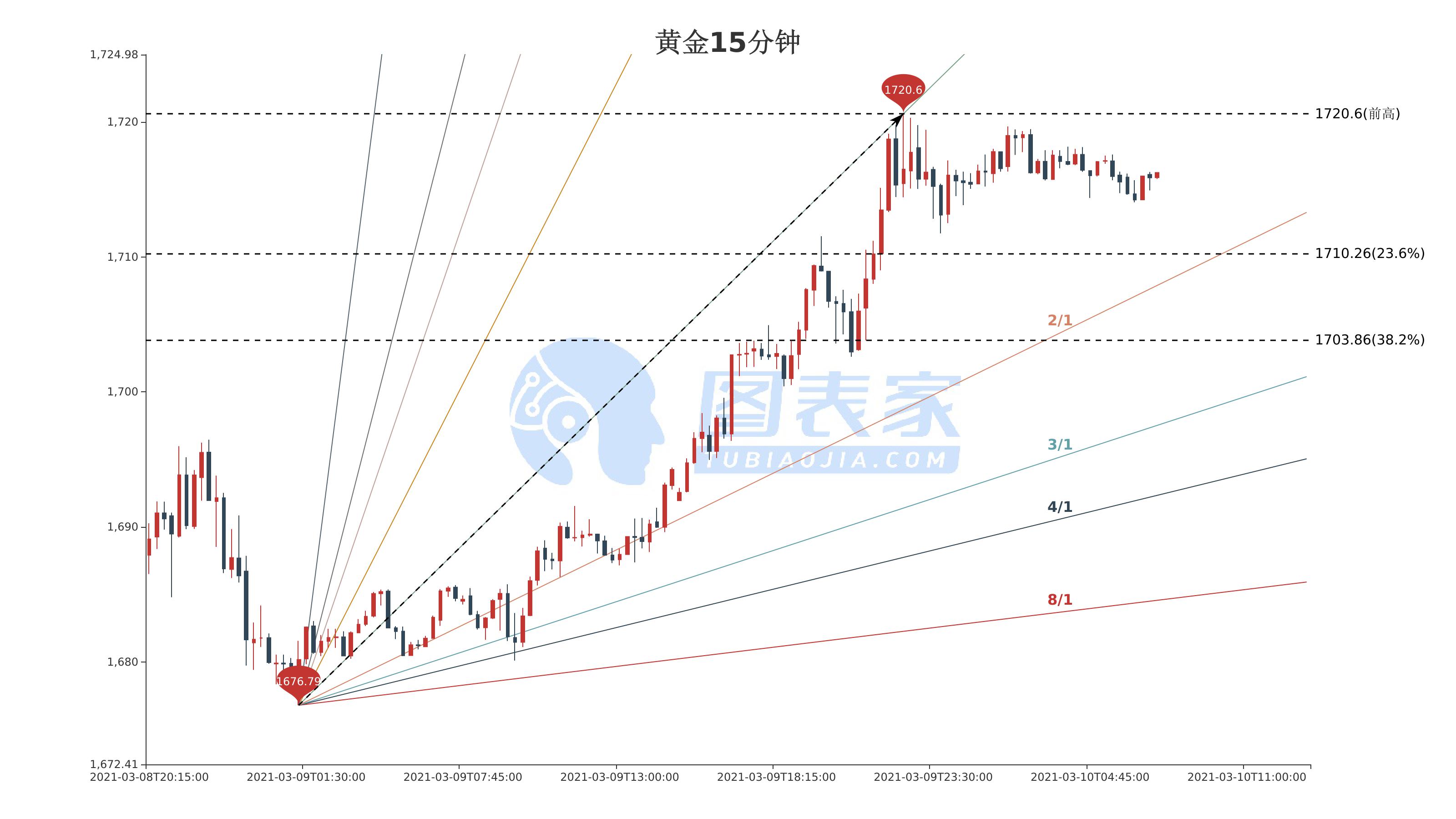 图为黄金15分钟走势图,价格短线走低,且正交投于前高1720.6下方,若价格持续下行,短线或测试斐波那契23.6%回调位1710.26支撑,跌破后盘中需关注2/1甘氏线,后市或将进一步看跌至斐波那契38.2%回调位1703.86。