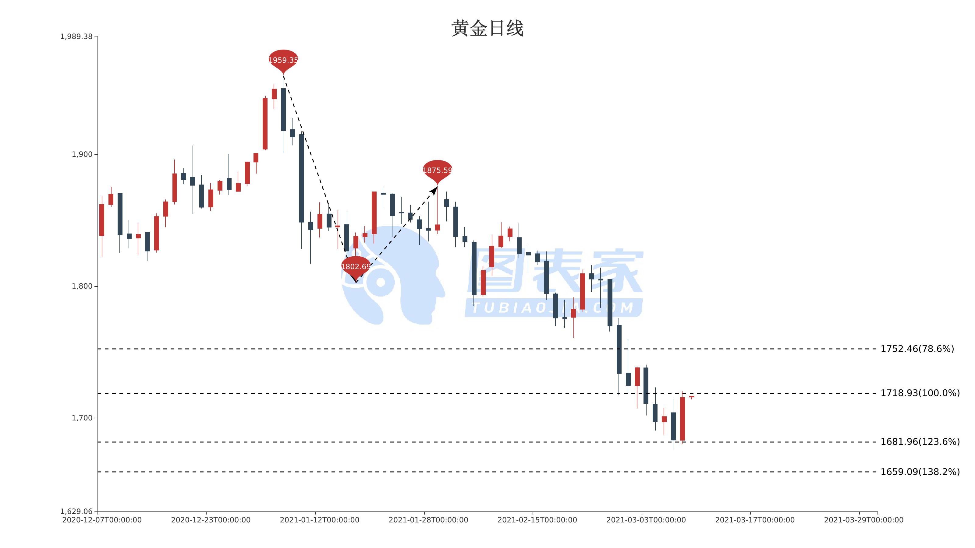 图为黄金日线走势图,价格持续走低,且正交投于斐波那契100.0%延展位1718.93下方,若价格继续下行,下方较近支撑位为斐波那契123.6%延展位1681.96,跌破后或将进一步看跌至斐波那契138.2%延展位1659.09。