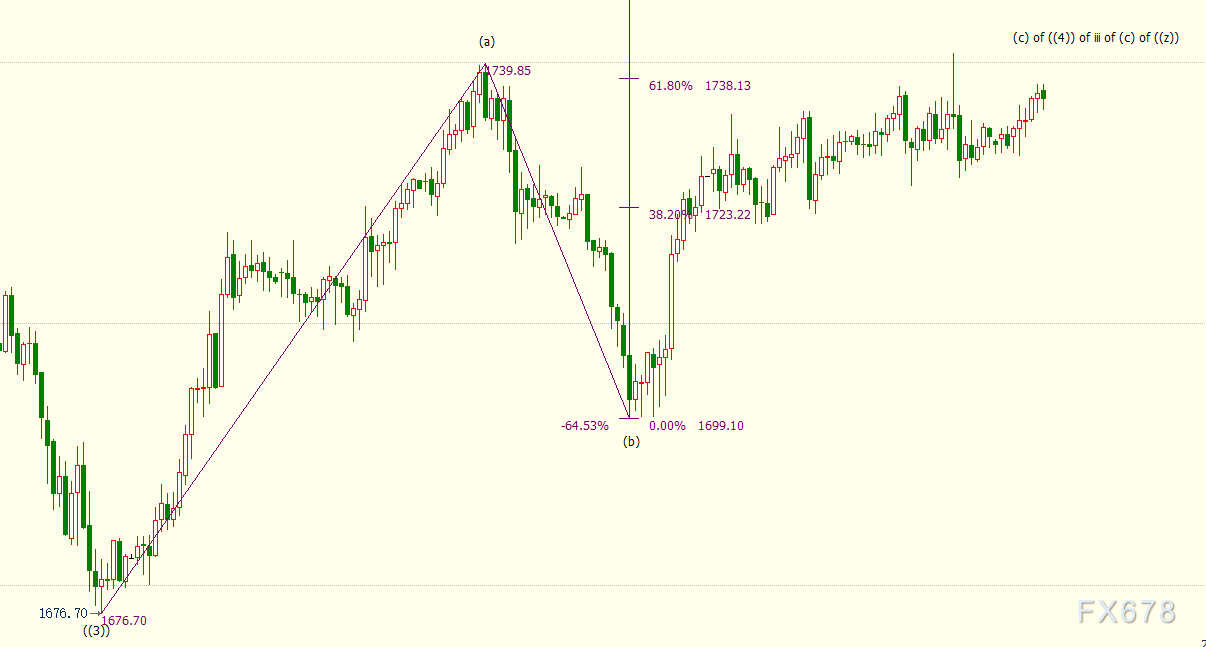 小时图上看,现货黄金处于自1699美元开启的反弹(c)浪中,已触及61.8%目标位1738美元,100%目标位上看1762美元。(c)浪属于自1676美元开启的反弹((4))浪走势。((4))浪是自1855美元开启下行iii浪的子浪。