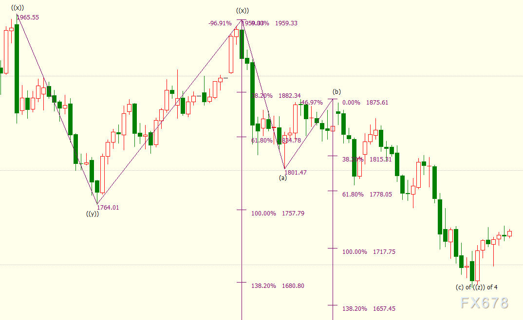 日线上看,iii浪是自1876美元开启的下行(c)浪的子浪,(c)浪是自1959美元开启的下行((z))浪的子浪。((z))隶属于自2075美元开启的4浪调整走势,4浪呈现((w))((x))((y))((x))((z))三重“之”字调整模式。((z))浪料将重新跌破138.2%目标位1681美元,并进一步下探161.8%目标位1633美元。