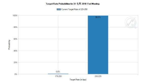按照目前市场价格,投资者认为本月降息的概率为100%,不过更有可能只降息25个基点。芝加哥商业交易所集团(CME Group)的FedWatch工具显示,利率期货走势表明,交易员目前认为7月底降息50个基点的可能性只有0.8%左右,远低于一周前的25%。