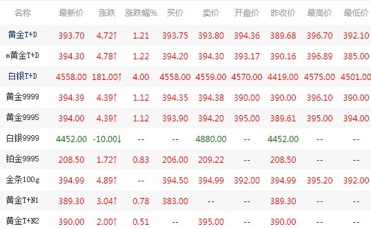 【交易所收盘】 上海黄金交易所黄金T+D10月10日(周一)收盘上涨0.89%报392.45元/克; 上海黄金交易所白银T+D10月10日(周一)收盘上涨4.16%报4559.0元/千克。