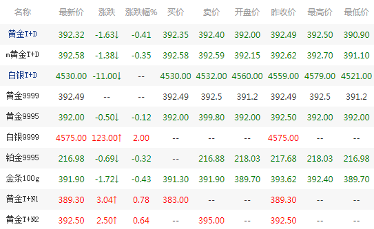 【交易所收盘】 上海黄金交易所黄金T+D10月11日(周二)收盘下跌0.49%报392.0元/克; 上海黄金交易所白银T+D10月11日(周二)收盘下跌0.62%报4513.0元/千克。