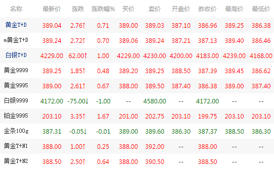 【交易所收盘】 上海黄金交易所黄金T+D9月6日(周二)收盘上涨0.76%报388.88元/克; 上海黄金交易所白银T+D9月6日(周二)收盘上涨1.2%报4223.0元/千克。