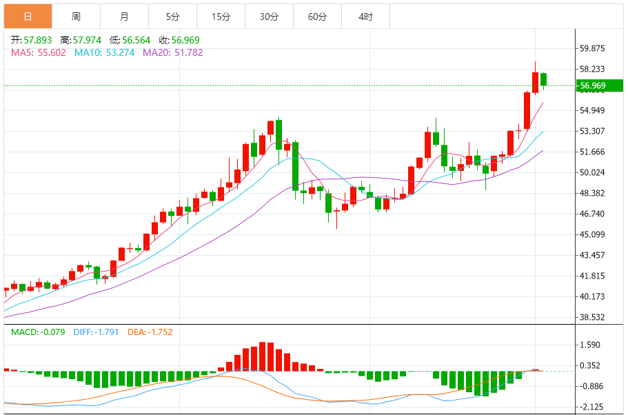 12月3日,白银在周三亚洲盘进入多头盘整阶段,并在本周早些时候触及的历史高点附近保持稳定。白银目前跌破58美元中段,日内下跌0.20%,缺乏后续抛售。 上周五持续突破54.40-54.50美元水平关隘,随后强劲上高创历史新高,被视为XAG/UD多头的关键触发点。然而,隔夜日线相对强弱指数(RI)对该商品构成阻力,建议在近期盘