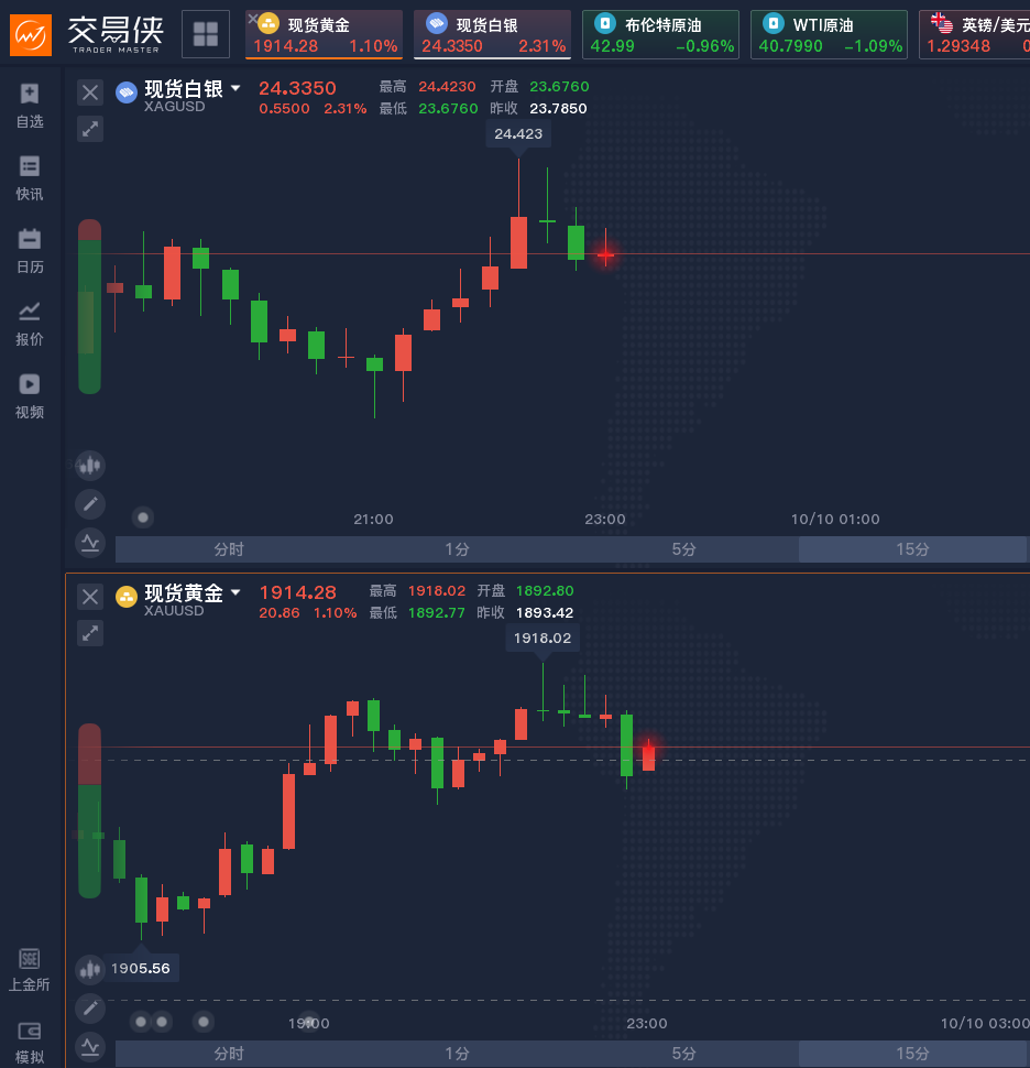 COMEX期银大涨,日内涨幅3.01%,现报24.59美元/盎司。现货白银涨超2%,现货黄金涨超1%。