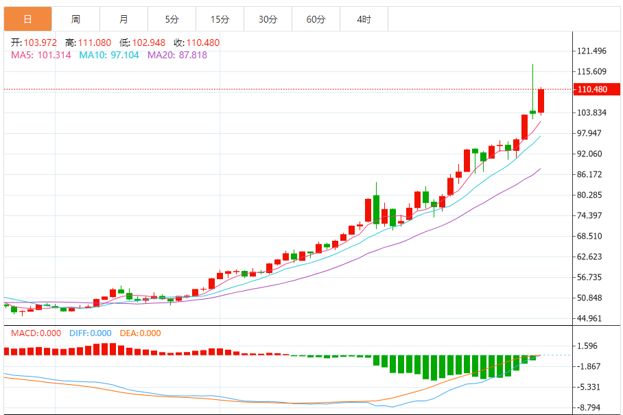 周二亚盘,白银走高,徘徊于109.48附近,相对强弱指数(RI)处于超买状态但并不极端,保持了在垂直价格走势中上行风险的活跃。 市场基本面分析 大宗商品分析机构22V的研究主管约迪·维瑟也认为,鉴于白银在过去一年中的迅猛上涨,市场会出现回调。但他并不认为工业需求会很快出现下滑。他说:“这并非白银的周期性波动
