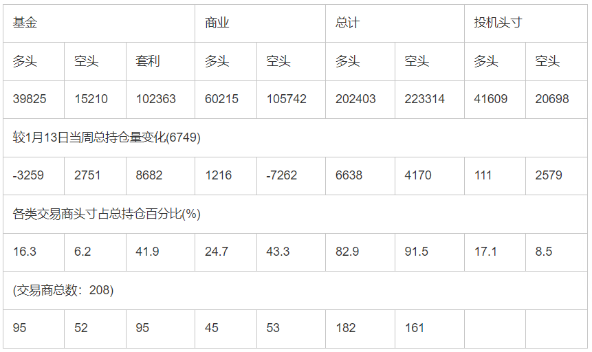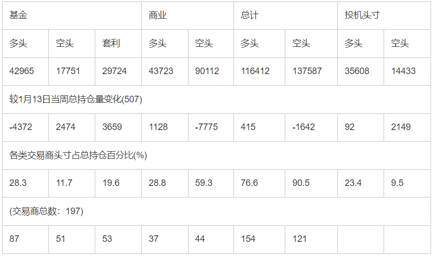 截止1月20日当周COX(纽约商品期货交易所)白银期货和期权分类持仓报告: 合约单位:(5000 金衡盎司的合同) 总持仓量:244012