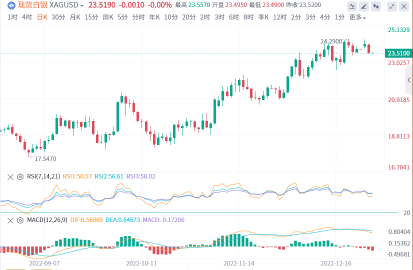 监於银价持续跌破12月16日以来的支撑,同时MACD信号看跌,银价可能会跌至相邻支撑23.50美元。