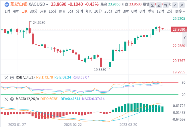 同时,相对强度指标(14)已经从60.00-80.00的看涨区间滑落到40.00-60.00的区间,这表明银价失去上涨动能。