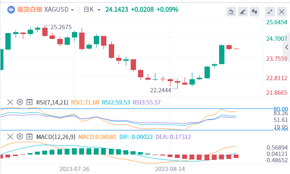 尽管如此,银价在周四从多日高点反转的同时,证明相对强度指标(14)超买和MACD指标将出现死叉。然而市场焦虑环境下,银价6月下旬至7月上行趋势的38.2%斐波那契回撤位(24.00美元整数关附近)成为空头目标。