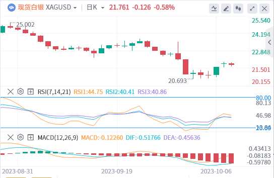 白银价格在上行之后在21.40-22.00美元的区间内横盘整理。贵金属在突破20.70-21.40美元区间形成的盘整后走强。位於21.66美元的50周期指数移动平均线(EMA)是银价多头的支撑位。RSI(14)转入40.00-60.00区间,预示未来的区间交投。