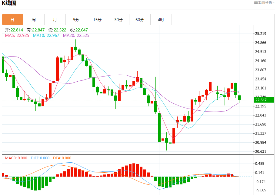 周三盘中,现货白银报22.723,跌幅0.47%。