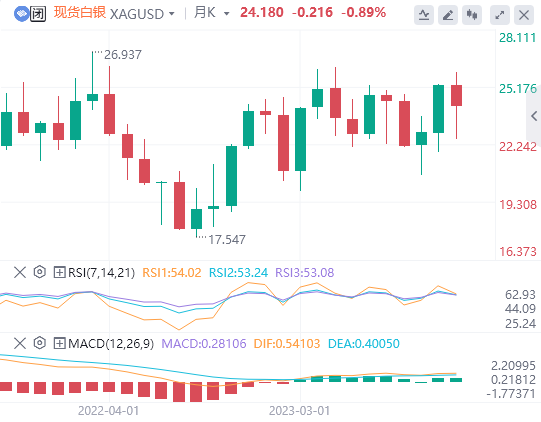 根据Trading Economics全球宏观模型和分析师的预期,“预计到本季度末,白银交易价格将达到每金衡盎司22.50美元”。该网站预测,12个月后,即2024年12月,白银交易价格将达到21.15美元。