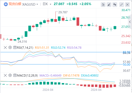今日白银略高于其关键点26.82美元,暗示潜在的看涨势头。如果它维持在该水平上方,则直接阻力位在27.40美元,然后是更高的门槛27.95美元和28.67美元。这些水平对于确定白银能否延续其上涨轨迹至关重要。