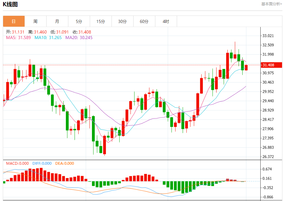 周二盘中,现货白银报31.308,涨幅0.54%。