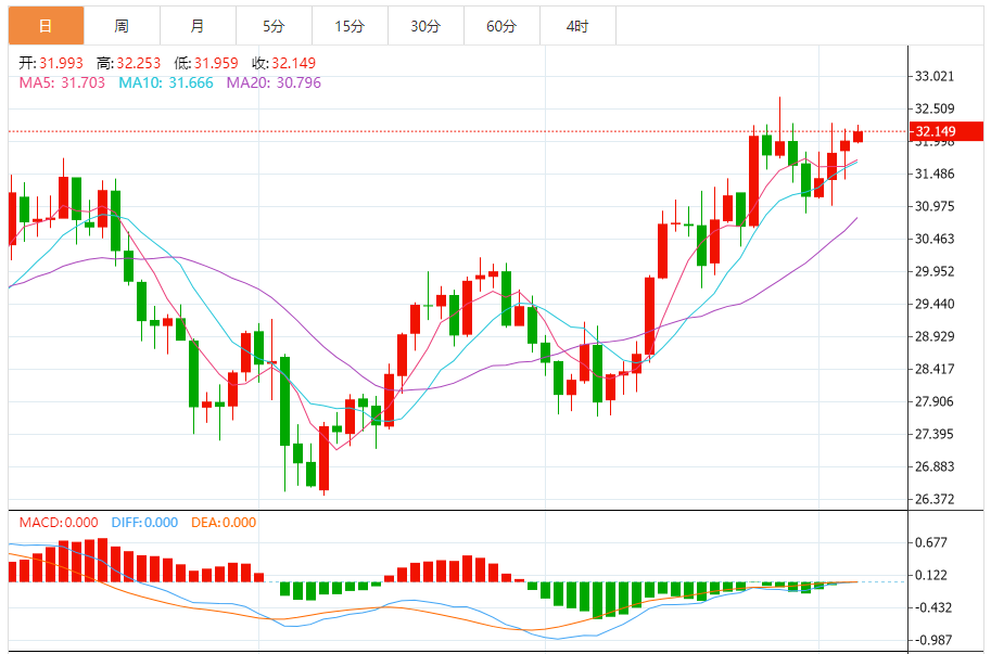 今天的预期交易区间:在31.90美元支撑位和32.70美元阻力位之间。