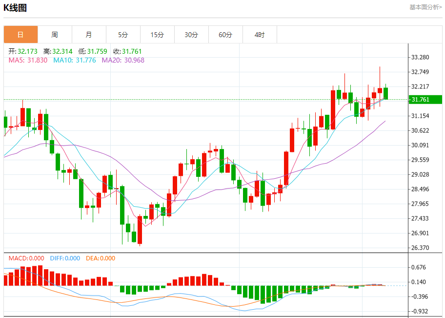 周一盘中,现货白银报31.644,跌幅1.60%。