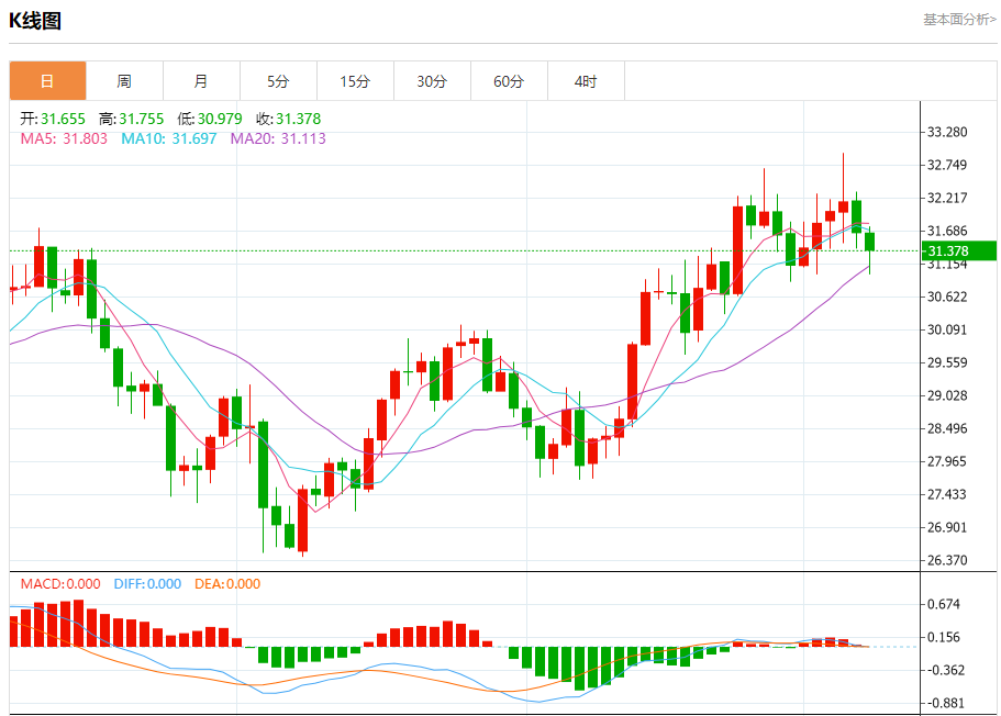 周二盘中,现货白银报31.412,跌幅0.79%。
