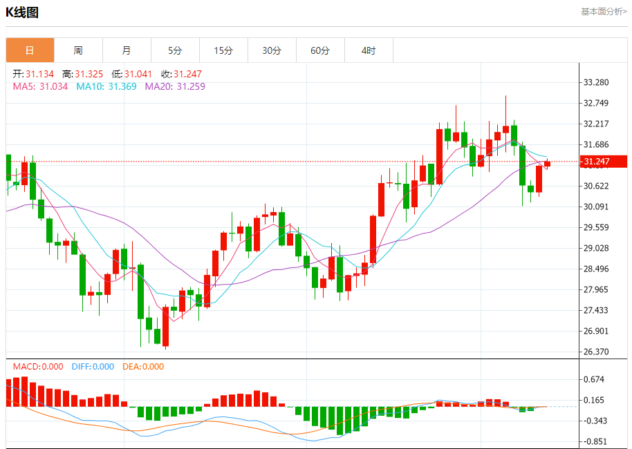 周五盘中,现货白银报31.312,涨幅0.57%。