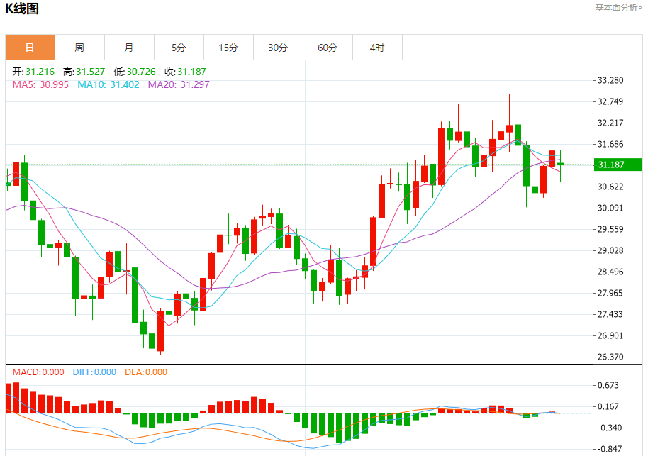 周一盘中,现货白银报31.190,跌幅1.06%。