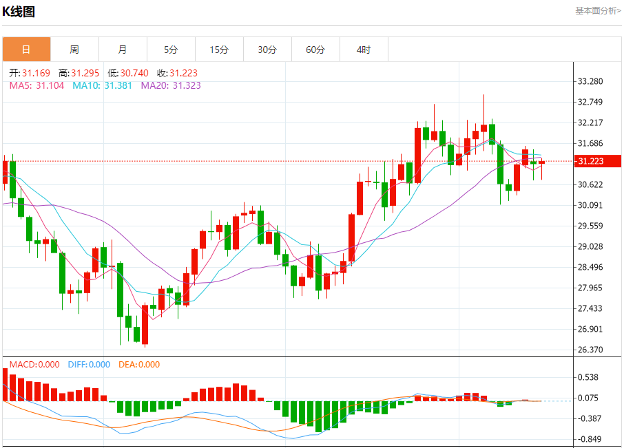 周二盘中,现货白银报31.237,涨幅0.25%。