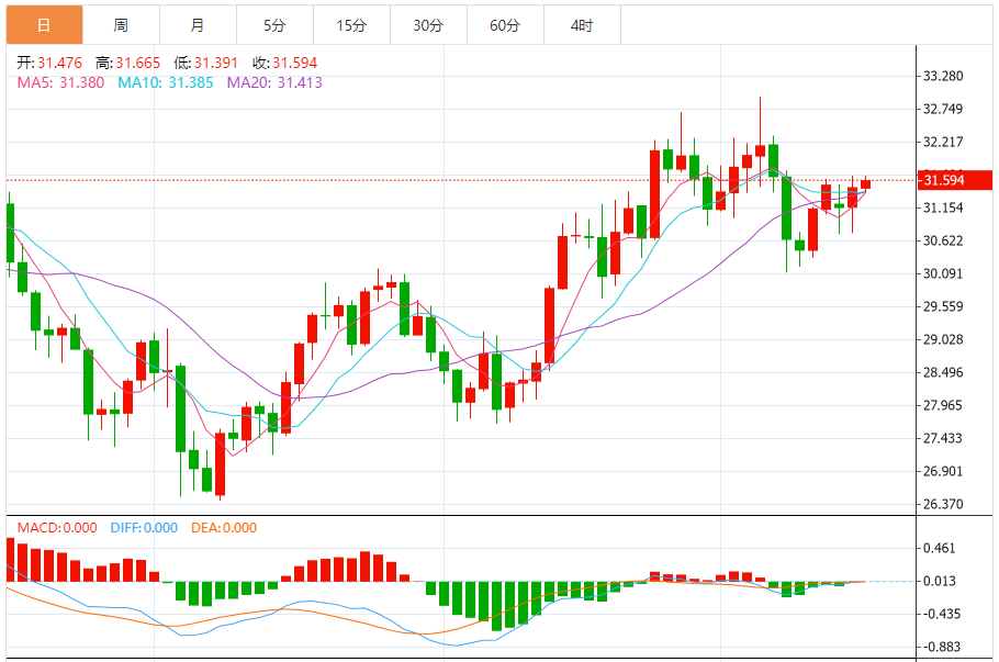 今天的预期交易区间:在31.30美元支撑位和32.10美元阻力位之间。