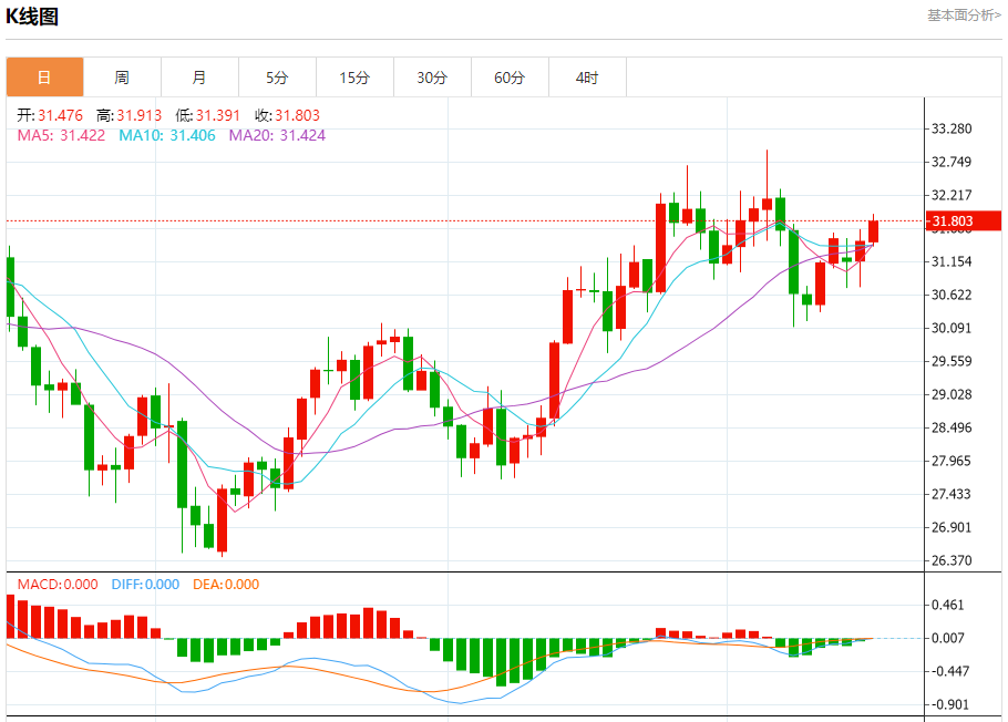 周三盘中,现货白银报31.889,涨幅1.29%。