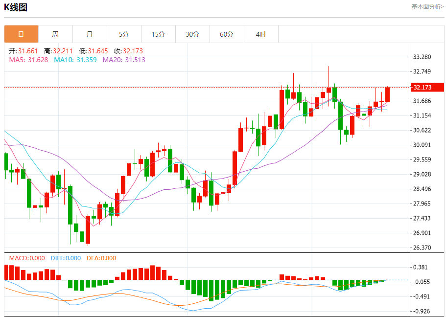 周五盘中,现货白银报32.269,涨幅1.89%。