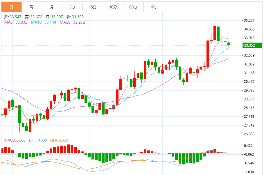 今天的预期交易区间:在32.70美元支撑位和33.70美元阻力位之间。