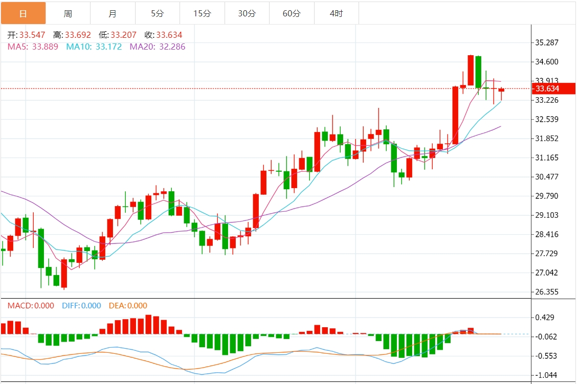 技术上,日图技术指标虽然一直在失去看涨动能,但仍保持在上涨区域。 这进一步表明,谨慎的做法是,等待银价明确跌破33.00美元关口,然后再对上周从2012年10月以来最高水平的回调设立头寸。 若跌破32.75-32.65美元阻力转支撑位后出现一些跟进卖盘将再次确认看跌倾向,并打压银价。