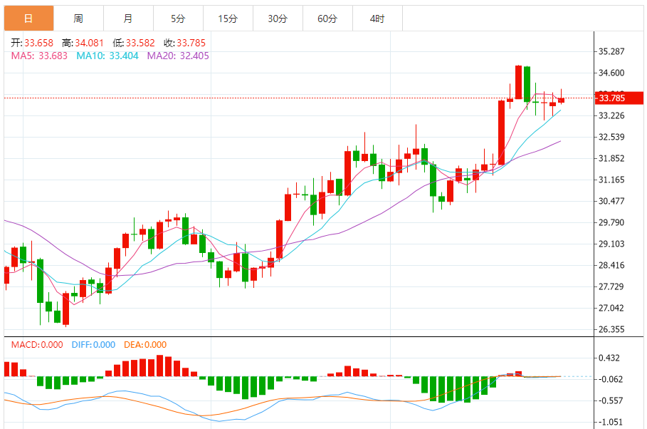 今天的预期交易区间:在33.40美元支撑位和34.30美元阻力位之间。