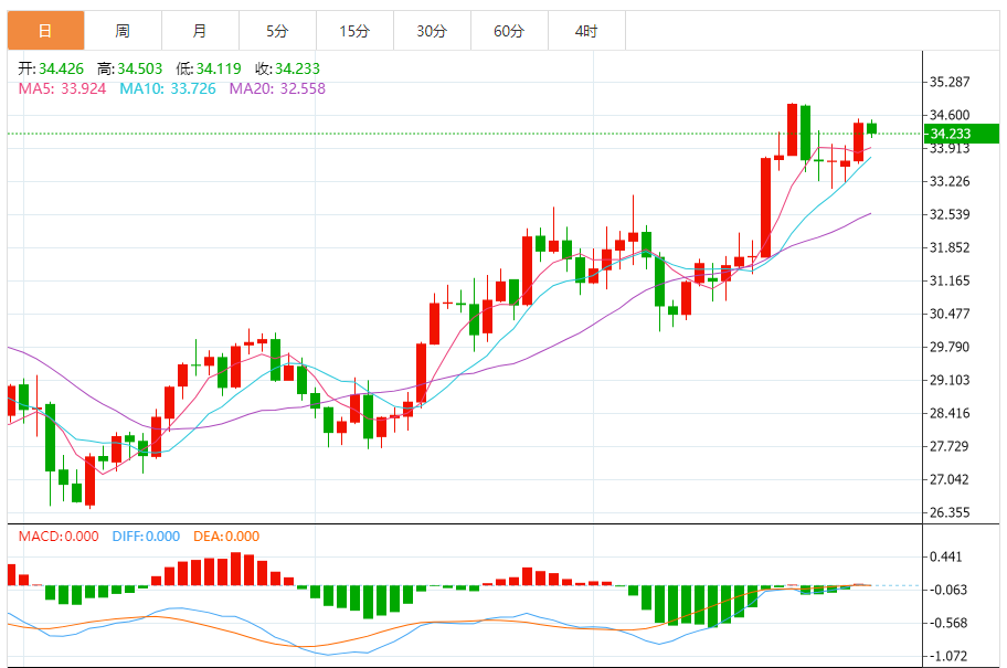 今天的预期交易区间:在34.00美元支撑位和34.90美元阻力位之间。