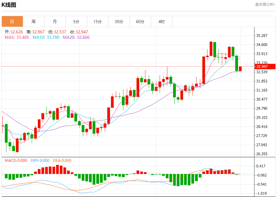 周五盘中,现货白银报32.948,涨幅0.96%。