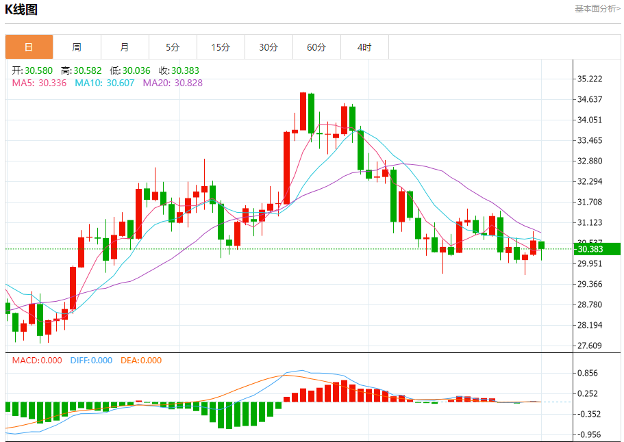 周一盘中,现货白银报30.385,跌幅0.74%。