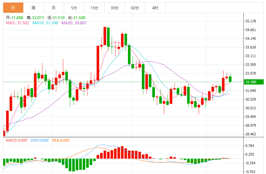 今天的预期交易区间:在31.60美元支撑位和32.50美元阻力位之间。