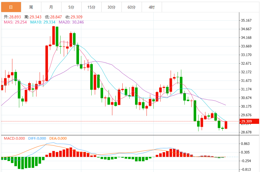 今天的预期交易区间:在28.70美元支撑位和29.65美元阻力位之间。