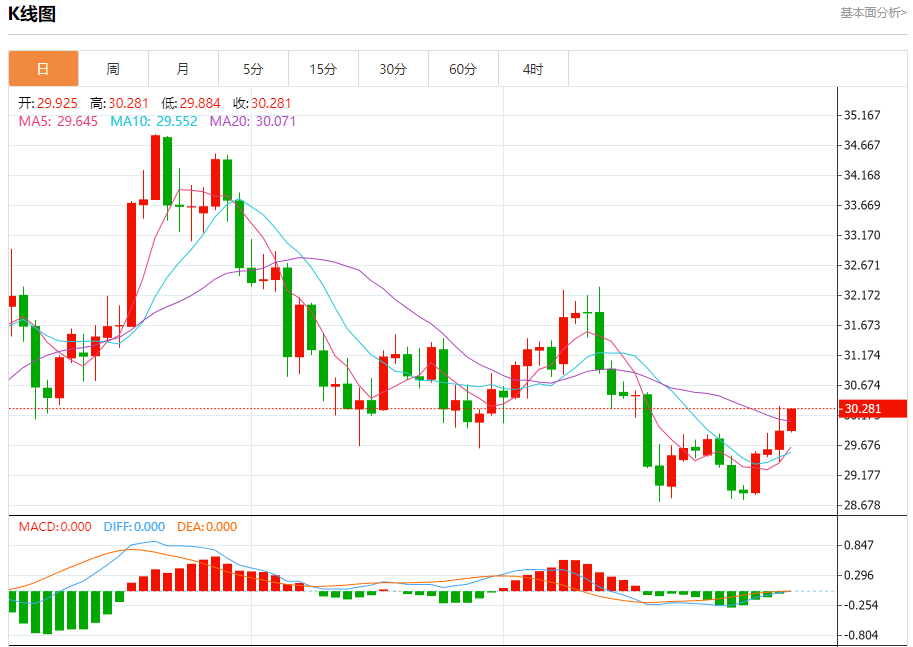 周二盘中,现货白银报30.290,涨幅1.20%。