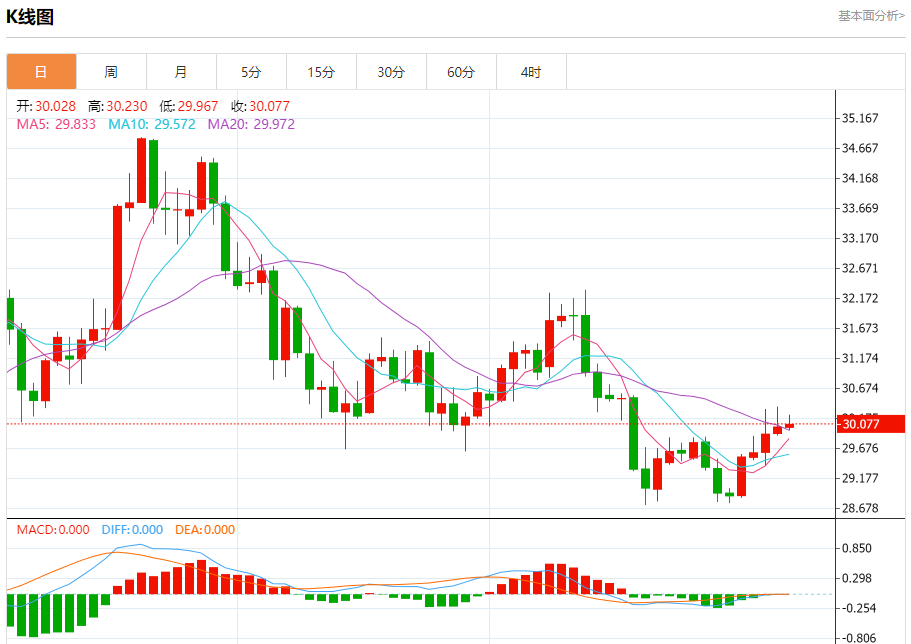 周三盘中,现货白银报30.063,涨幅0.10%。