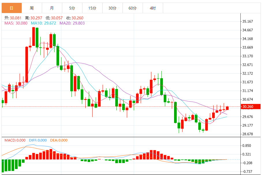 今天的预期交易区间:在29.95美元支撑位和30.80美元阻力位之间。
