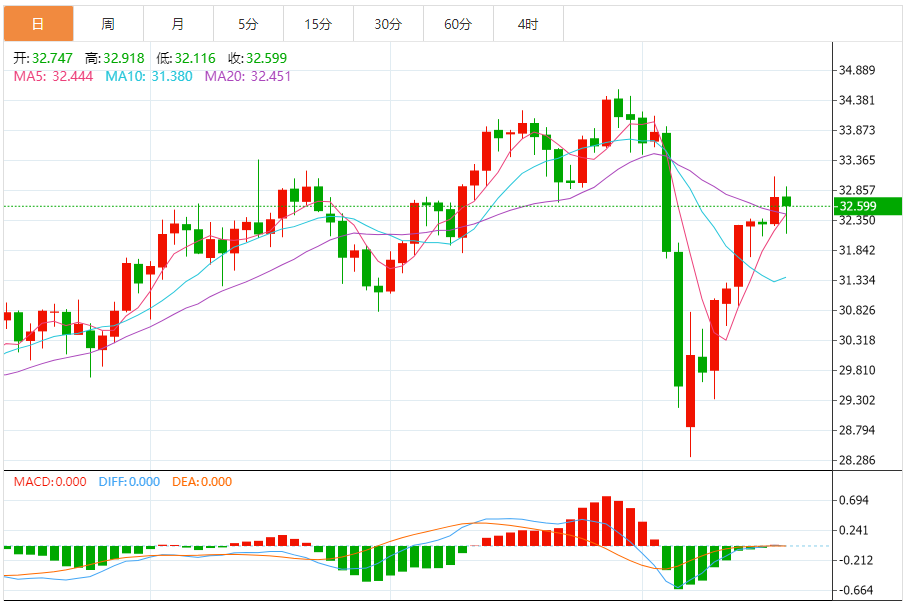 周四(4月17日),现货白银目前位于32.590美元/盎司附近,跌幅为0.45%。