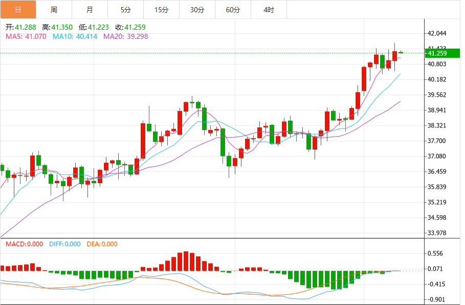 日线图显示,白银上周突破关键阻力位40.50美元后,目前在41.00美元上方进行盘整。白银价格远高于其21日简单移动平均线(39.10美元),相对强弱指数(RSI)徘徊在71附近,虽显示超买状态,但也反映出强劲的上行势头。
